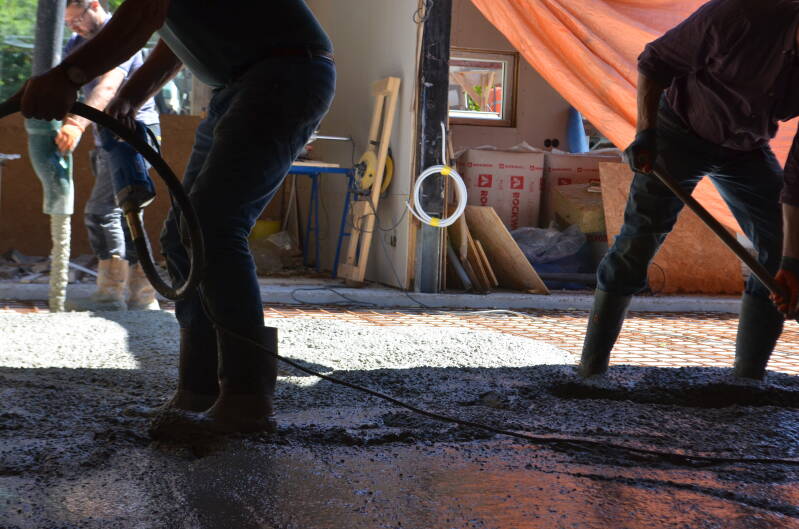 De volgende dag was het beton al uitgehard en kan Geja zich met de veger uitleven: het moderne THUIS WERKEN.