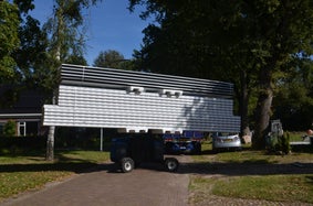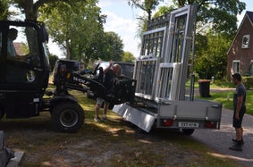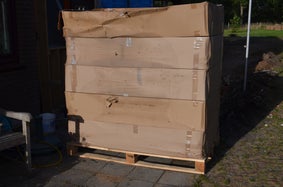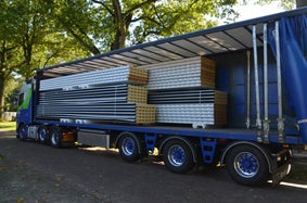 Een groot transport, de hele lading is bestemd voor Boerderij Zikken. De chauffeur lost dat allemaal in zijn uppie. Hij heeft een heftruck die alle kanten op kan rijden. In een half uurtje staat alles naast het huis.