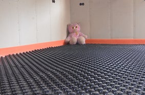 De gipsplaten allemaal bevestigd aan de muren; de bouwplaats kan leeg gemaakt en aangeveegd. De vloerverwarming is nu aan de beurt! De zwarte platen worden gelegd en daarin worden de buizen gelegd waardoor het warme water stroomt die zorgt voor de warmte!