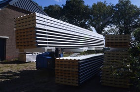 En dan worden we gebeld door Pro-Finish , de leverancier van de dakplaten. We komen 25 september de panelen afleveren op de Polweg. Er wordt ruimte gemaakt naast het huis, zodat ze zo dicht mogelijk bij het dak staan.