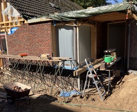 De fundering voor de achtermuur is uitgehard en kan er op gemetseld worden.