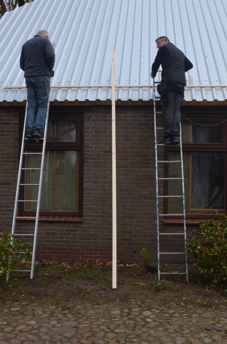 De wolfseinden zijn nog bedekt met een dekkleed: de sandwichpanelen moeten er nog op. Deze actie kost wel iets meer tijd; de panelen moeten gezaagd en pasklaar gemaakt worden. We hebben een hoogwerker gehuurd, want om de panelen met een ladder of steiger naar boven te sjorren is haast niet te doen.